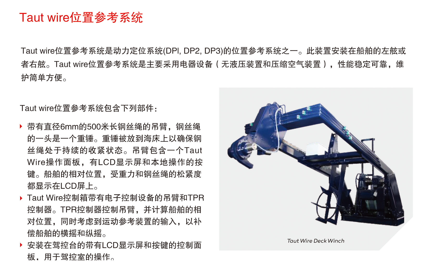 位置測量系統及傳感: 張繩系統/全球差分定位系統/激光/雷達/聲學定位測量系統/陀螺羅經/風傳感器/運動參考單元 性能亮點: 為客戶量身定制高性價比“全級別動力定位系統解決方案”,滿足客戶施工作業的特殊要求;產品成熟、技術先進、應用廣泛,全球數百套應用業績,深得客戶好評與信賴;強大穩定的系統性能可大幅度提升船舶的工作效率,為業主提供高精度、可靠、安全的作業保障;優越的人性化操作界面,解決語言障礙,便于操控人員掌握;具備全研發、全生產線系統;具備低耗能,低故障率特性;具備優秀的擴展、兼容能力,具有實施一站式集成配套的能力,大幅度提高效率,降低成本