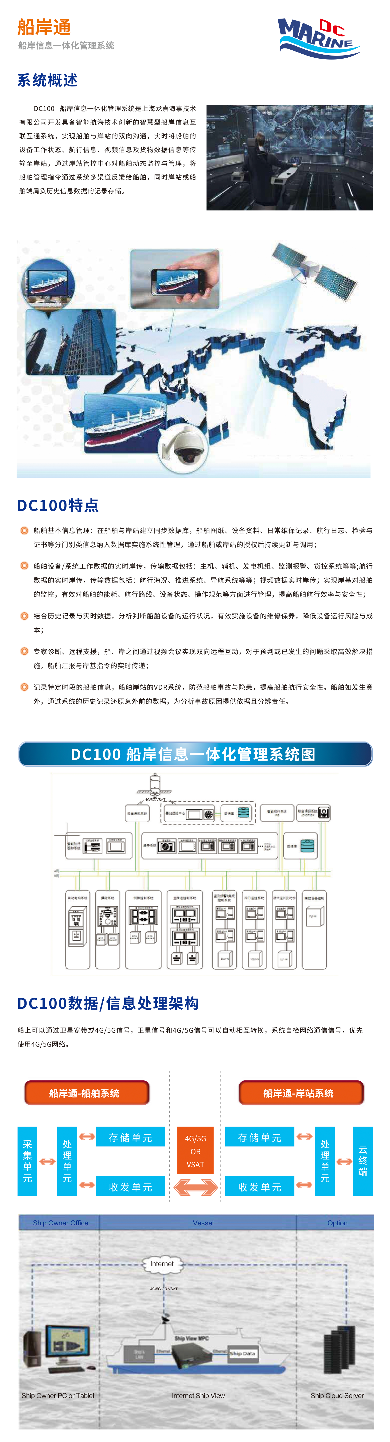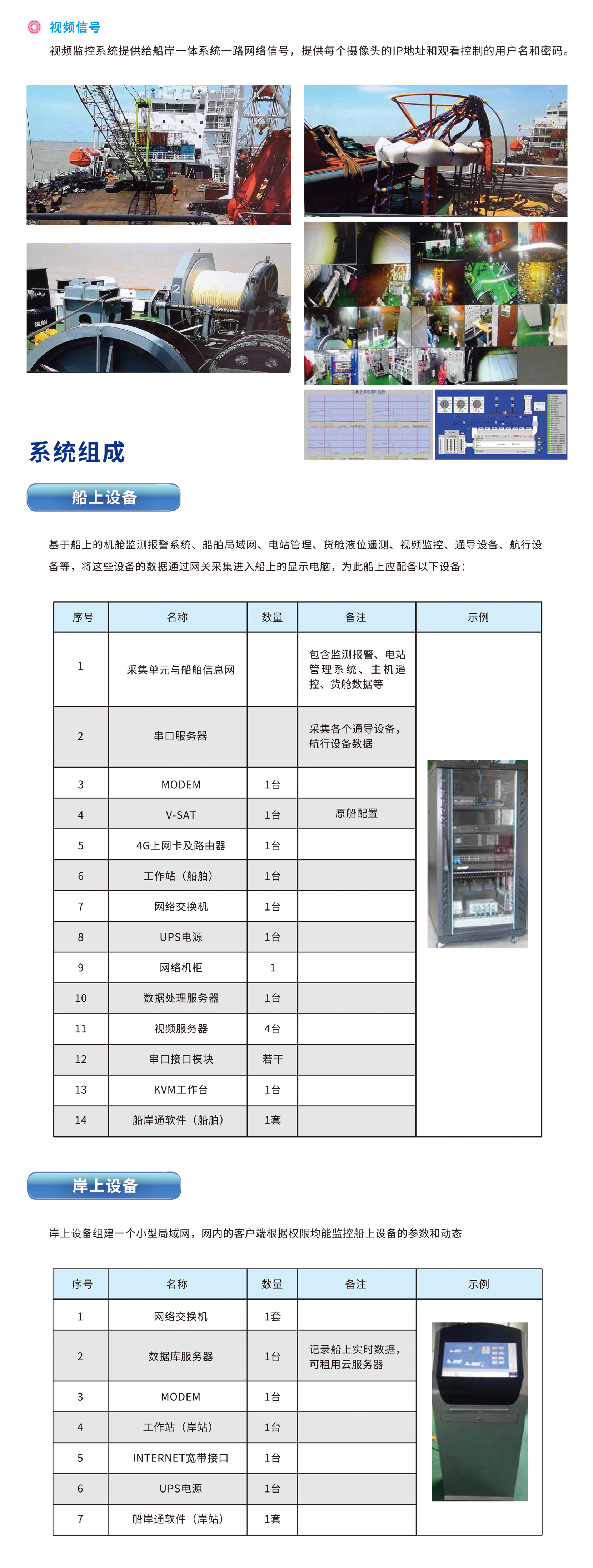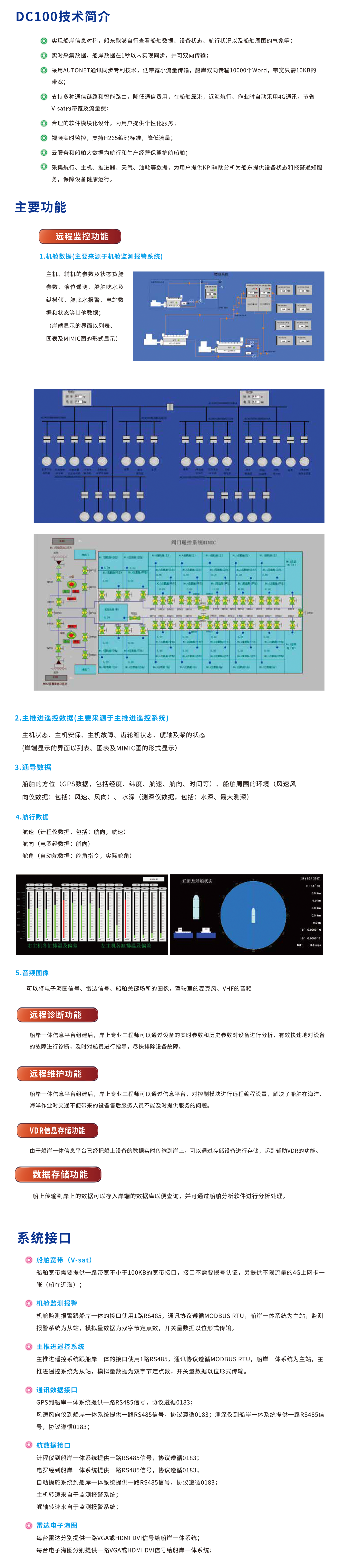應用場景: 對?船舶基本信息進行管理;實現?船舶設備/系統工作數據的實時岸傳;??結合歷史記錄與實時數據,分析判斷船舶設備的運行狀況,有效實施設備的維修保養,降低設備運行風險與成本;??專家可實施遠程診斷、遠程支援;??記錄特定時段的船舶信息,船舶岸站的VDR系統,防范船舶事故與隱患,提高船舶航行安全性;船舶如發生意外,通過系統的歷史記錄還原意外前的數據,為分析事故原因提供依據且分辨責任 特性亮點: 實現船岸信息對稱,船東能夠自行查看船舶數據、設備狀態、航行狀況以及船舶周圍的氣象等;實時采集數據,船岸數據在1秒以內實現同步,并可雙向傳輸;實現低帶寬小流量傳輸;?支持多種通信鏈路和智能路由,降低通信費用,在船舶靠港,近海航行、作業時自動采用4G通訊,節省帶寬及流量費;?合理的軟件模塊化設計,為用戶提供個性化服務;視頻實時監控,支持H265編碼標準,降低流量;??云服務和船舶大數據為航行和生產經營保駕護航;?采集航行、主機、推進器、天氣、油耗等數據,為用戶提供KPI輔助分析,為船東提供設備狀態和報警通知務,保障設備健康運行
