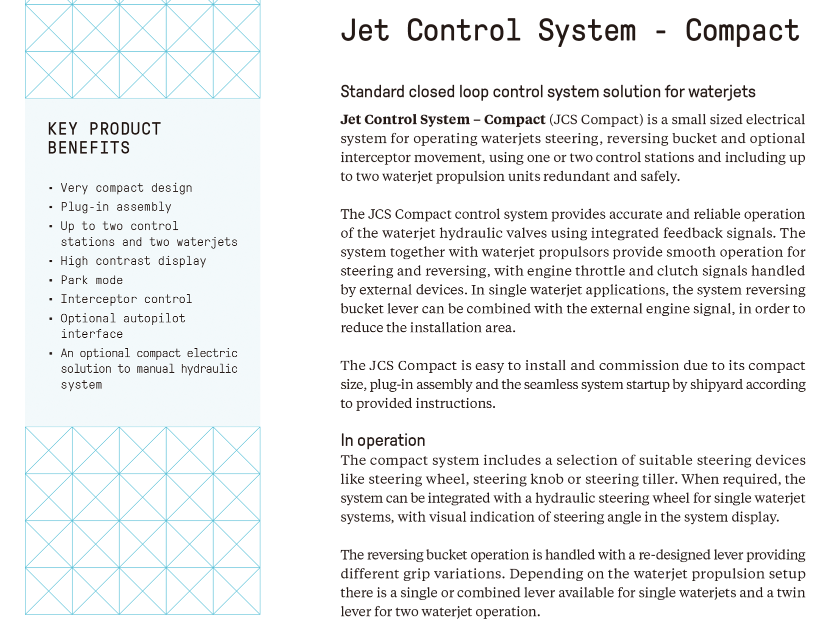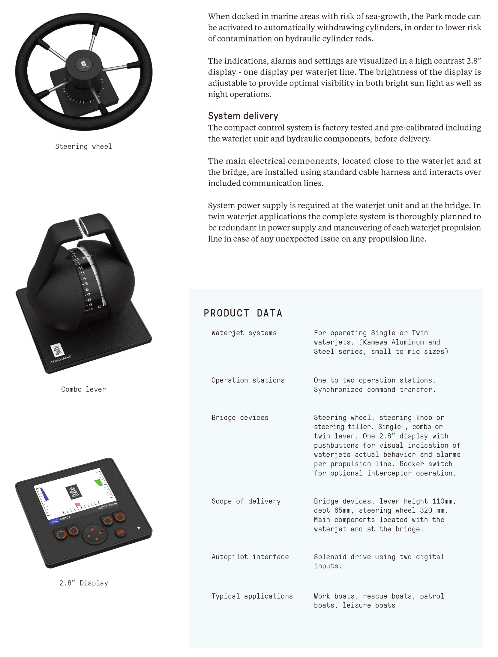 | 系統特點: | ·Available for both single and twin waterjet configuration with one or two remote control stations ·Excellent feed back feeling in the levers and the helm ·Compact and robust mechanism made of high quality aluminium and stainless materials ·Hydraulic control valve with pressure relief valve as standard |